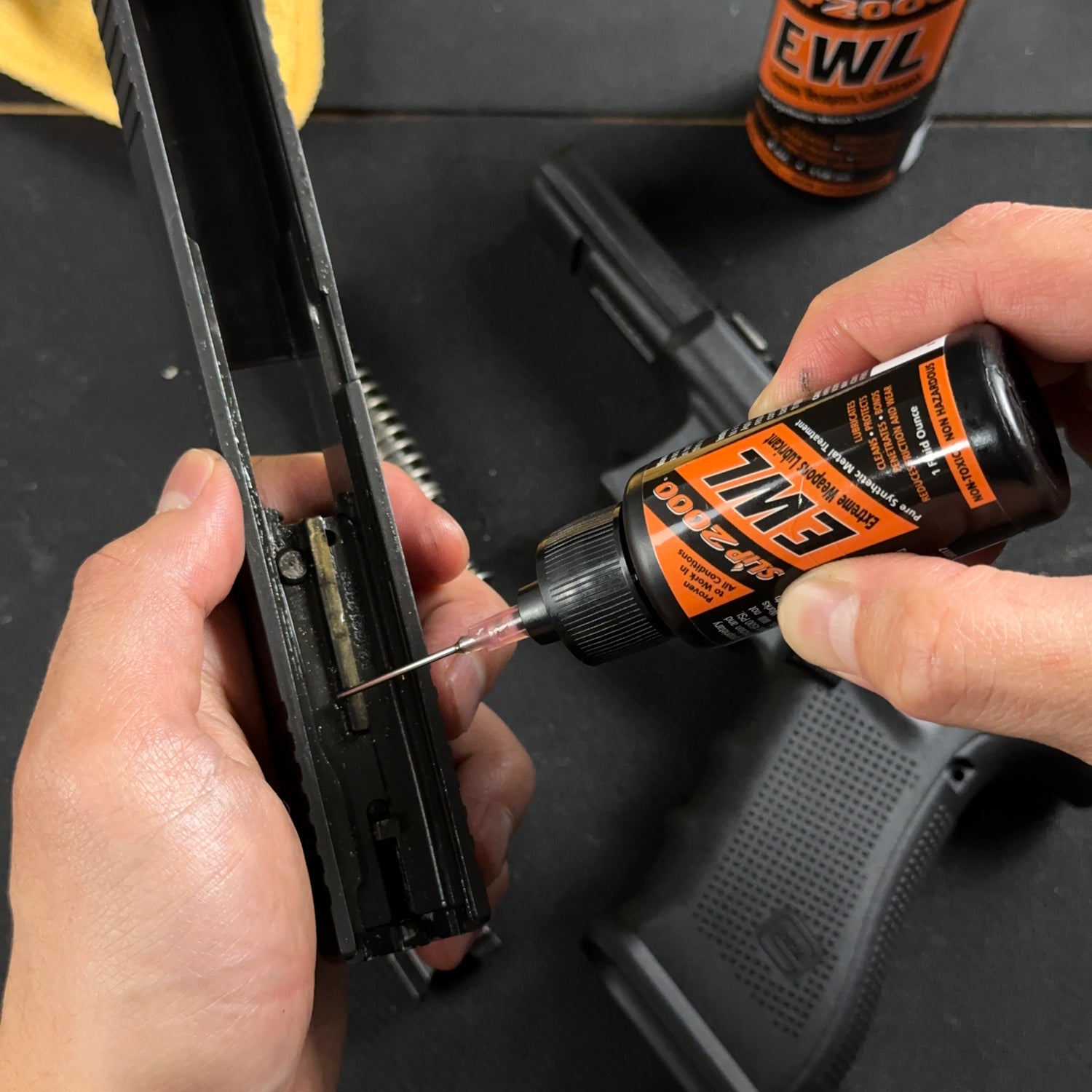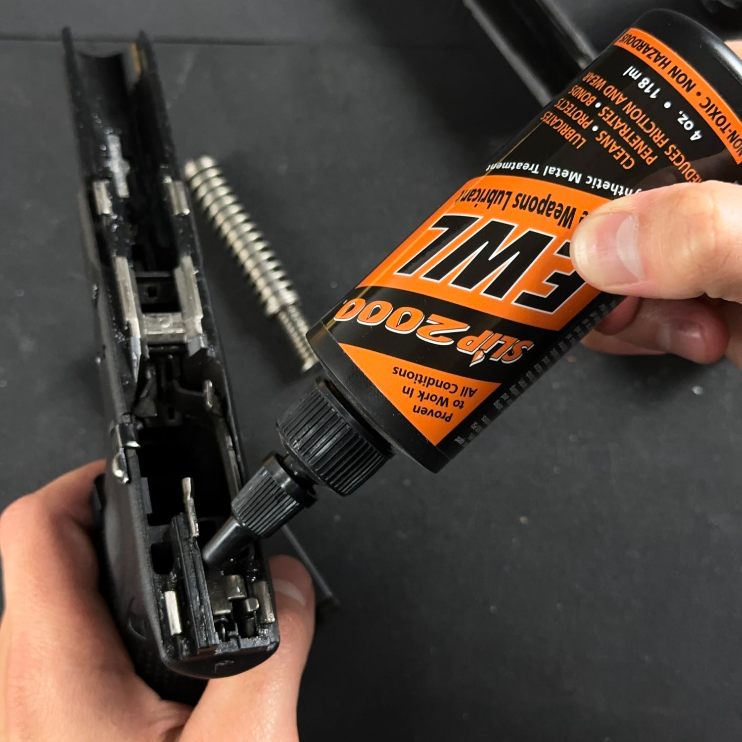 Slip 2000 EWL is our most popular lubricant and is recommended for use on semi-automatic and full-auto rifles and pistols that see high round counts. Use like a metal treatment applying a thin coat everywhere. After firing 2000 - 4000 rounds, simply wipe your gun clean just using EWL. Excellent for use in cold or dusty environments. Not ideal for long term storage. Can be used on all firearms.