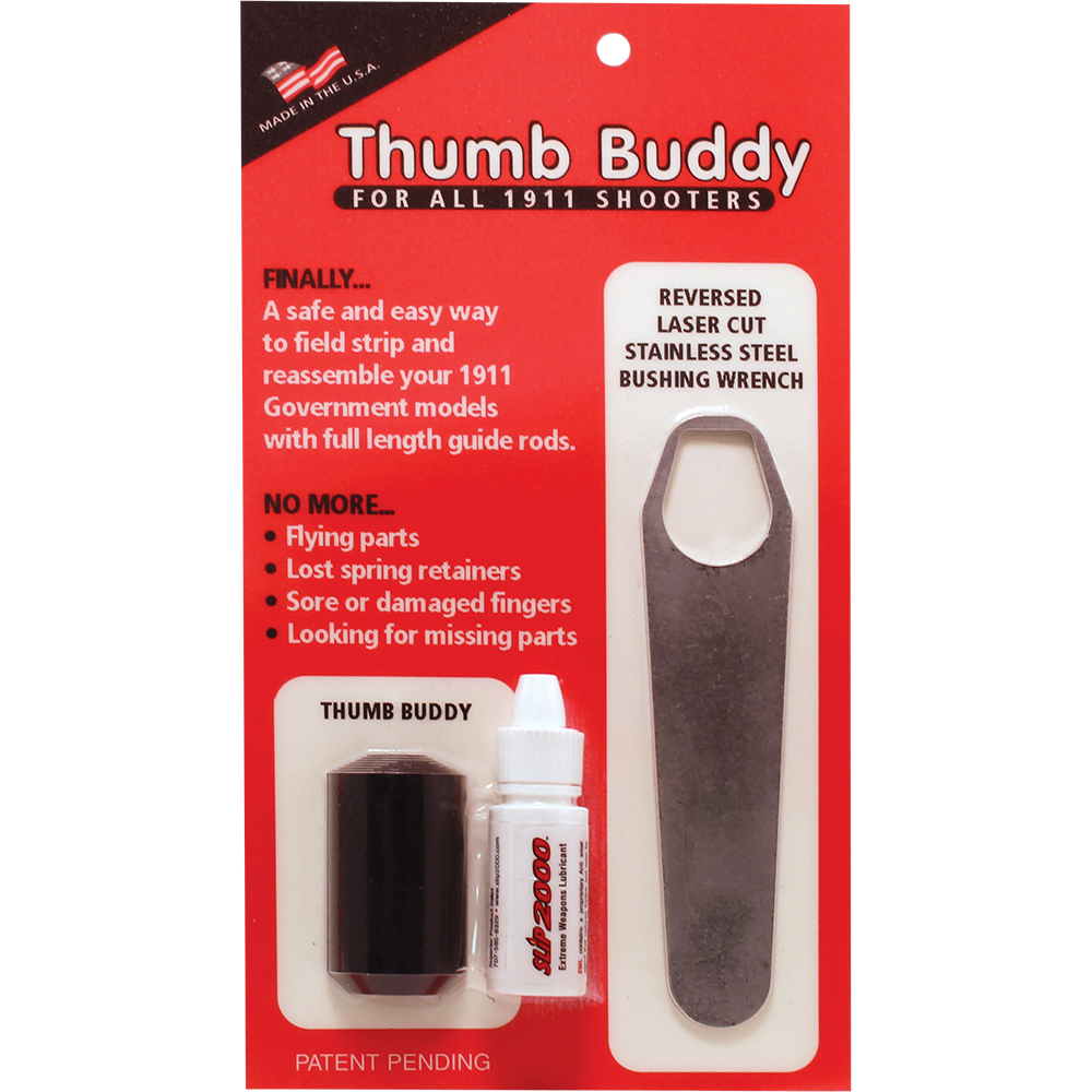 Do you hate taking apart your 1911 pistol with full length guide rod? Well now you no longer have to. The Thumb Buddy (PATENT PENDING) is machined from delrin bar stock and lets you control the recoil spring retainer with ease. It fits the bottom of the pistol perfectly and now you're in control and not the spring. The reversed laser cut, stainless steel bushing wrench lets you turn even a fitted bushing with the Thumb Buddy in place. No more sore or damaged finger. No more flying parts. No more lost spring retainers. The Thumb Buddy can be used with a full length or standard guide rod.
